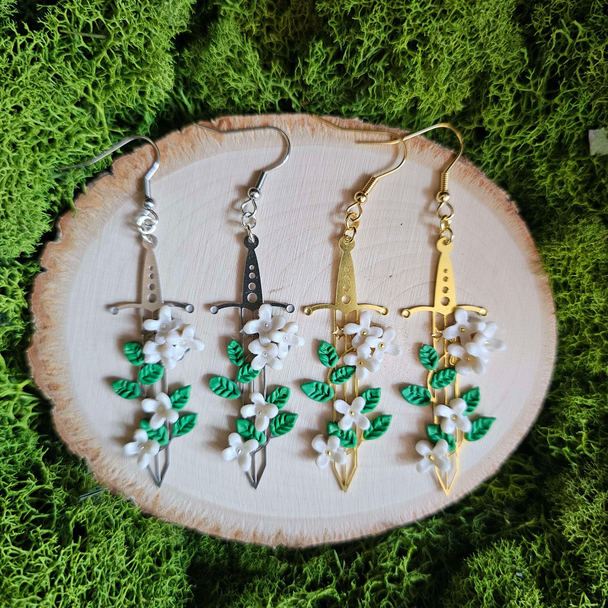 White Blossom Floral Fantasy Sword Clay Earrings